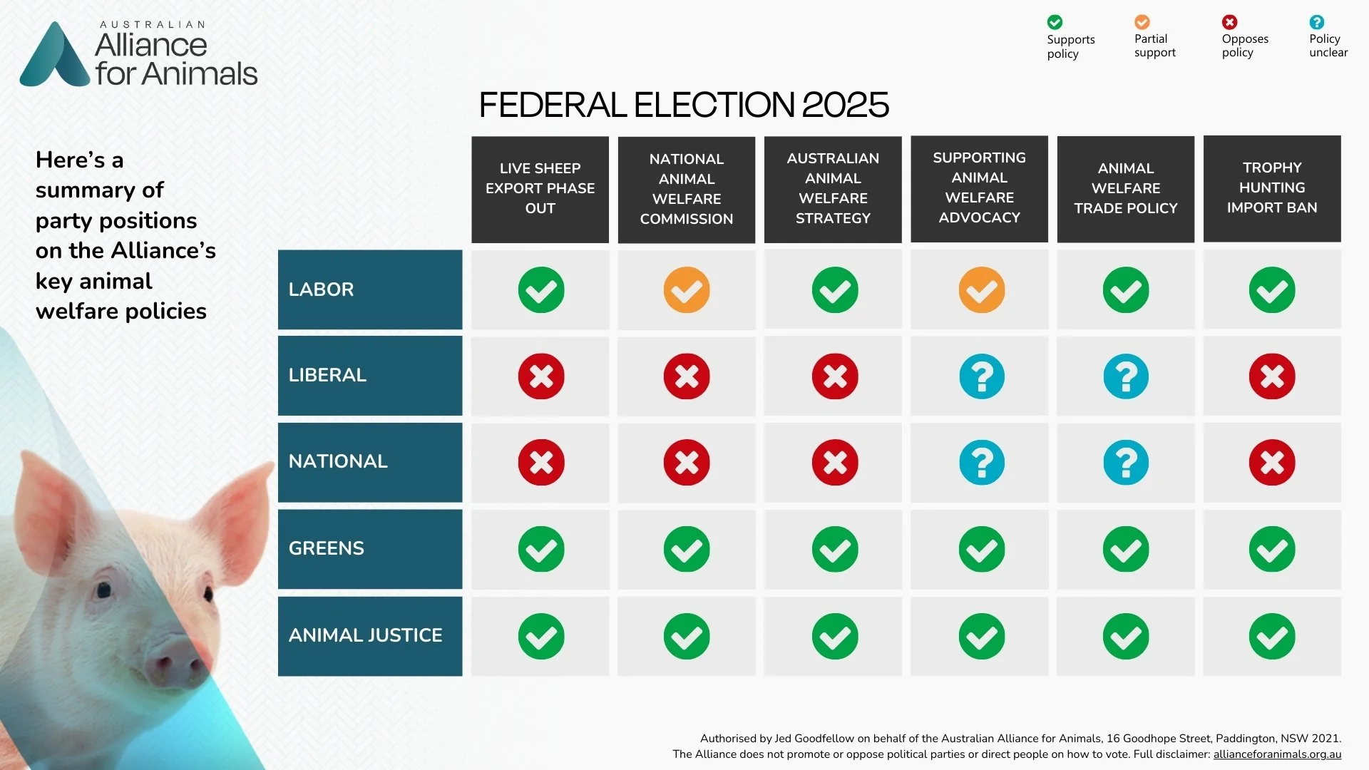 In the lead up to the Federal Election 2025, we released a set of scorecards outlining party and candidate positions on the Alliance’s key animal welfare policies.