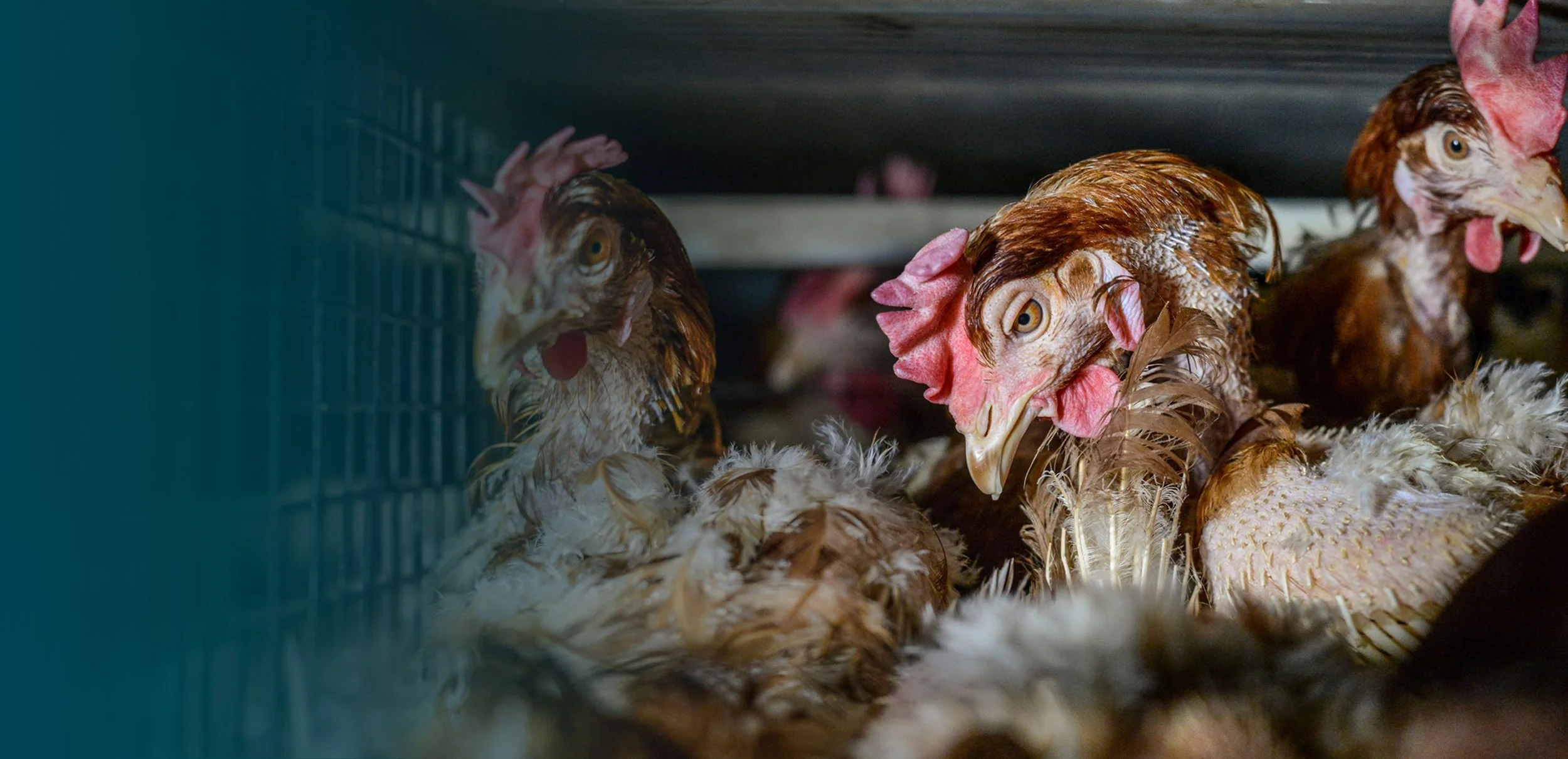 Battery cages are small wire cages that are designed to house layer hens. They pose significant welfare issues for hens, restricting important natural behaviours such as foraging, nesting, perching, and stretching their wings. These cramped and barren conditions lead to physical ailments like bone weakness and feather loss, and cause hens immense psychological stress on a daily basis.