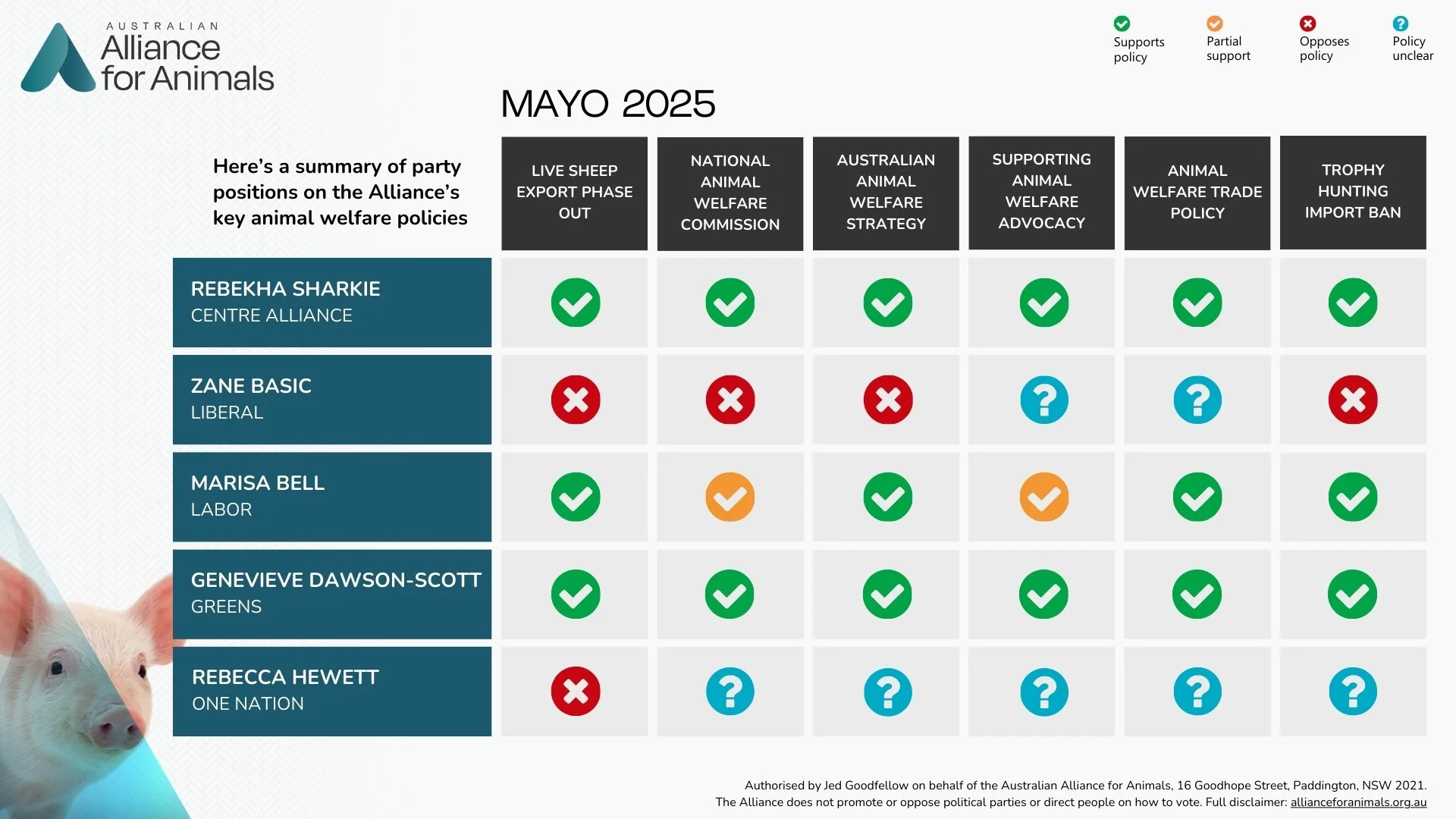 The scorecards have been prepared to raise awareness of the interests of animals and prevent animal suffering by summarising the position of political parties on the key animal welfare policy issues relevant to the charitable purposes of the Australian Alliance for Animals.